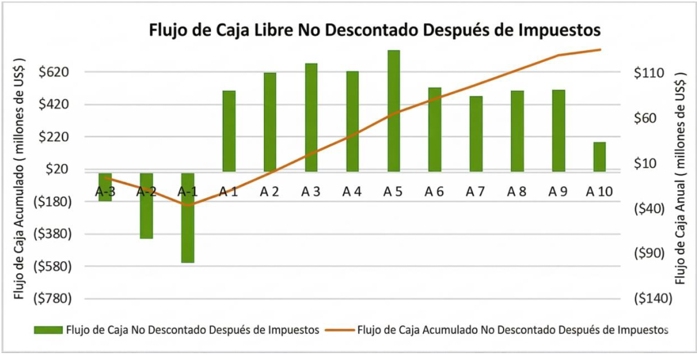 El flujo de caja no descontado después de impuestos para el LOM $727 millones (ver Figura 2), y el AISC (all-in sustaining cost) promedio para el LOM por onza de oro equivalente vendida se estima en $1.295/oz AuEq5.