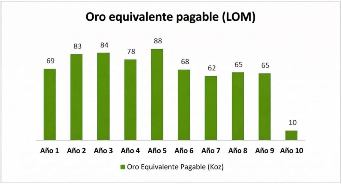 La Planta Porvenir está diseñada para alcanzar recuperaciones metalúrgicas promedio durante la vida útil de la mina (LOM) de 88,4% para el oro, 84,9% para la plata, 84,5% para el zinc y 69,9% para el cobre. Bajo el PFS 2026, se espera que el Proyecto Porvenir genere ventas anuales promedio de 72,3 Koz AuEq5, 54,5 Koz Au, 190 Koz Ag, 28 Mlb Zn y 3,75 Mlb Cu durante los años 1 a 9 de la vida de la mina (años de producción plena). Ver Figura 3.