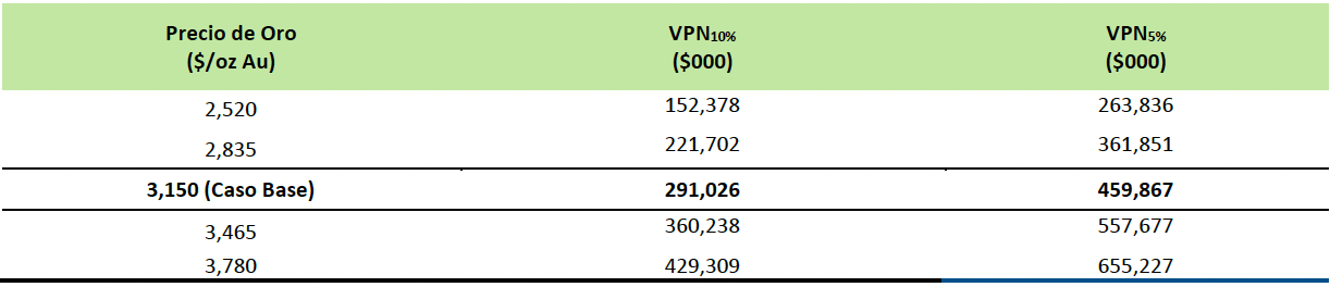 El análisis financiero del Proyecto Porvenir demuestra que las Reservas Minerales son económicamente viables a los precios de consensus de $3.150/oz Au, $45,00/oz Ag, $4,72/lb Cu y $1,22/lb Zn durante la vida de la mina (LOM). Para el caso base del PFS 2026 resulta en un VPN después de impuestos a una tasa de descuento del 5% de aproximadamente $460 millones, una TIR después de impuestos de 37,9% y un payback de aproximadamente 2,0 años desde el inicio de la producción.