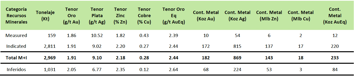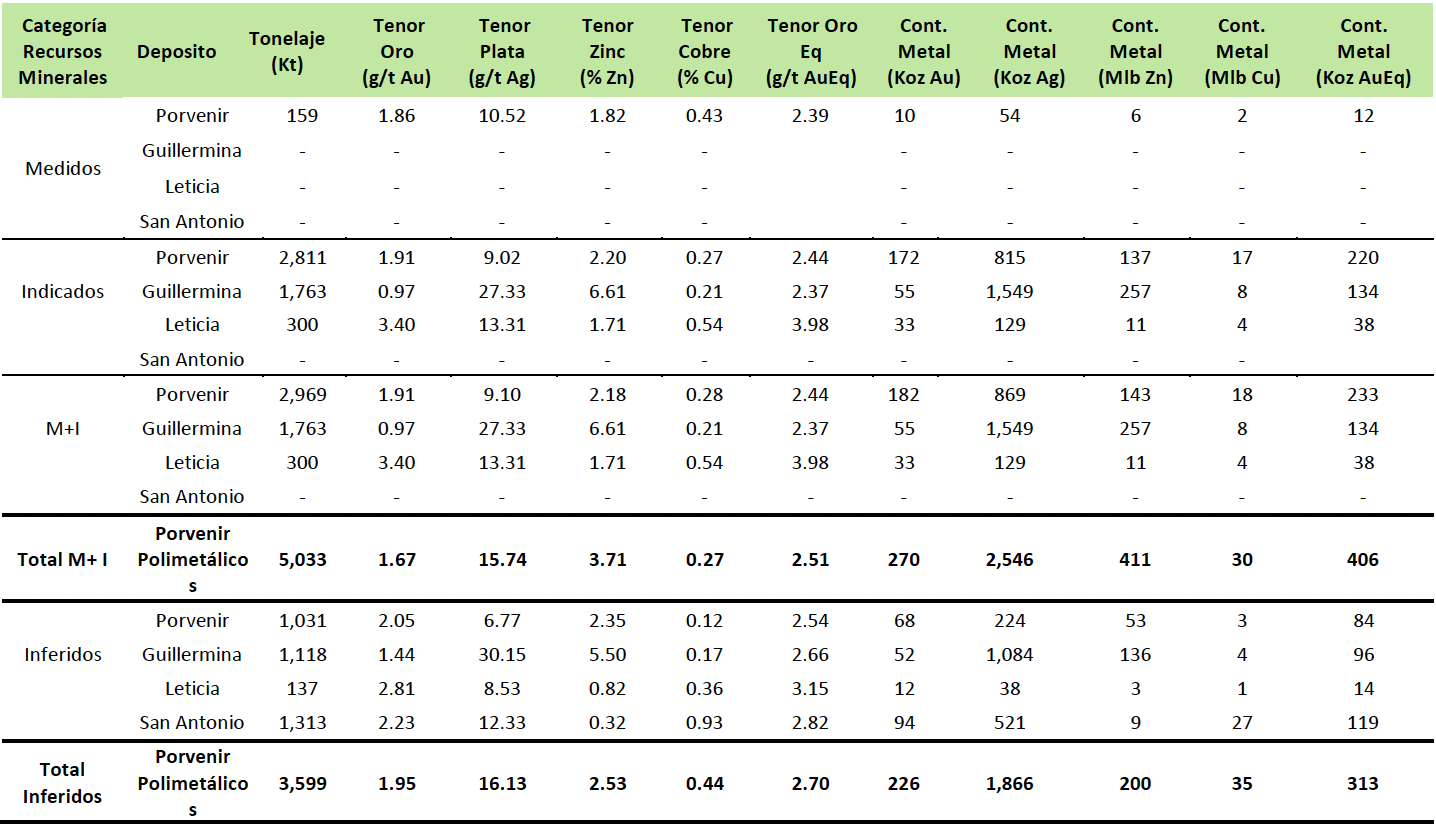 Tabla 4: Recursos Minerales del Distrito Polimetálico Porvenir al 31 de diciembre de 2025