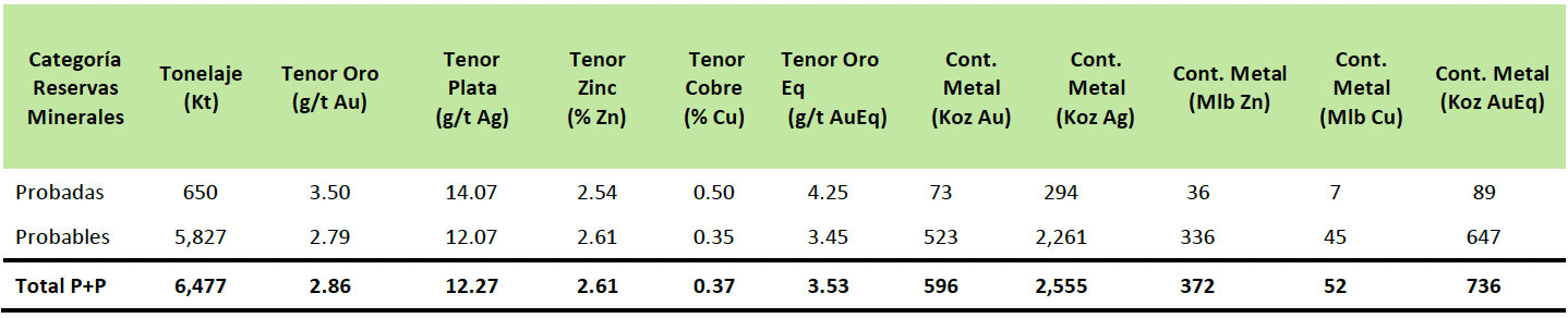5. Las Reservas Minerales se estimaron utilizando los precios de los metales a largo plazo de $2,150/oz Au $24/oz Ag, $1.01/lb Zn y $3.33/lb Cu.