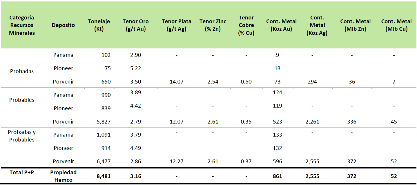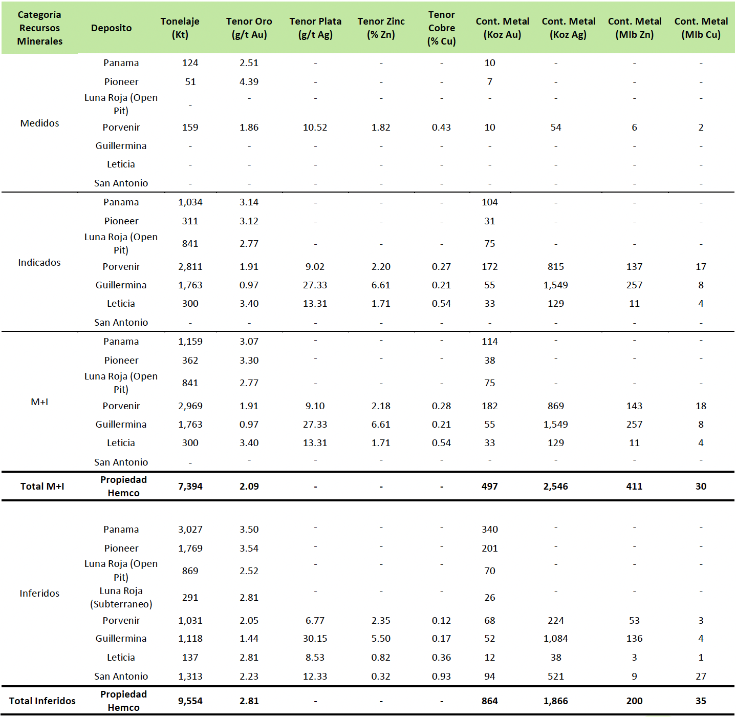 Los Recursos Minerales de la Propiedad Hemco es presentado en la Tabla 5, por depósito y exclusivo de las Reservas Minerales, al 31 de diciembre de 2025, incluye las minas Panamá y Pioneer, junto con los depósitos Porvenir, Guillermina, Leticia, San Antonio y Luna Roja.