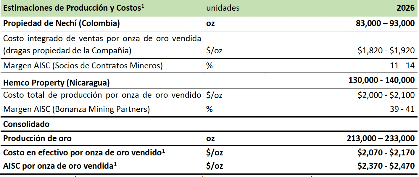 Para Nechí (Colombia), Mineros tiene como objetivo una producción constante de oro de 83.000 a 93.000 onzas en 2026. Las dragas de propiedad de la empresa deben operar dentro de un rango de costos AISC de $1,820–$1,920 por onza, respaldado por un enfoque operativo continuo y control de costos. Se espera que los socios mineros contratistas entreguen un margen de AISC del 11 % al 14 %, reforzando un perfil constante y confiable de generación de efectivo.