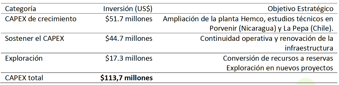 Aproximadamente el 84% del capital de crecimiento de la Compañía se dirige a Nicaragua, respaldado por un proyecto de $23 millones para ampliar la capacidad de procesamiento de Hemco de 1,800 a 2,500 tpd. Esta iniciativa es la primera etapa de un enfoque disciplinado para aumentar la producción mediante la expansión de la capacidad orgánica.