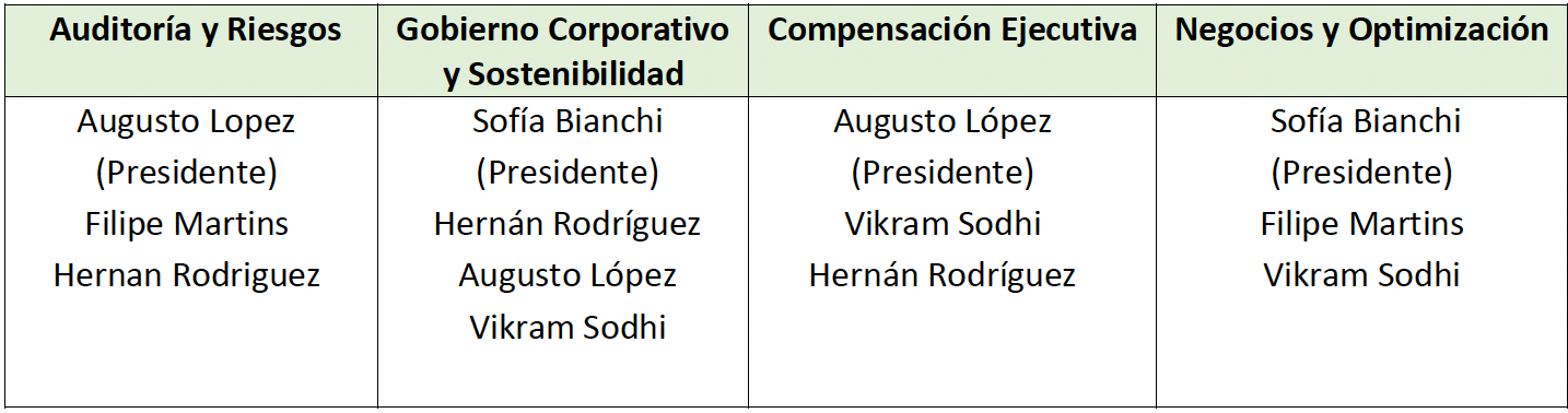 Los comités de apoyo a la Junta Directiva estarán integrados así: