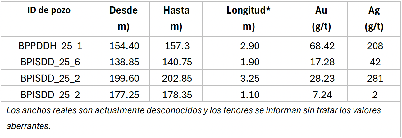 BPISDD_25_2: Interceptó 3.25 m (longitud del núcleo) con tenores de 28.23 g/t Au y 281 g/t Ag.