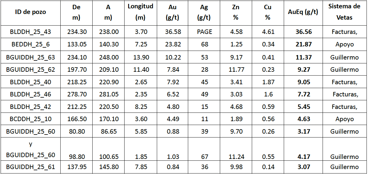 Sistema Guillermina: El pozo BGUIDDH_25_63 arrojó 13.90 m (longitud de núcleo) con tenores de 10.22 g/t Au, 53 g/t Ag, 9.17% Zn y 0.41% Cu.