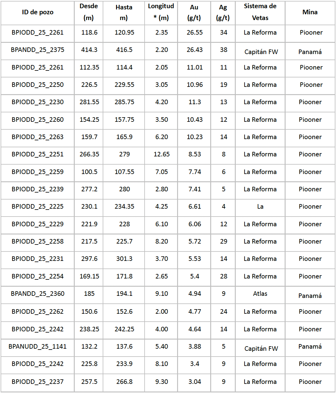 En la mina Pioneer, la perforación de cierre de malla y de definición ha confirmado la continuidad de las zonas de alto tenor dentro del sistema de vetas La Reforma. En la Mina Panamá, la perforación ha confirmado y extendido localmente la mineralización dentro de los sistemas de vetas Capitán FW y Atlas. Estos resultados respaldan futuras mejoras en la planificación minera a corto plazo y se espera que apoyen futuras actualizaciones de los planes mineros y contribuyan a extender la vida útil de la mina en ambas operaciones.