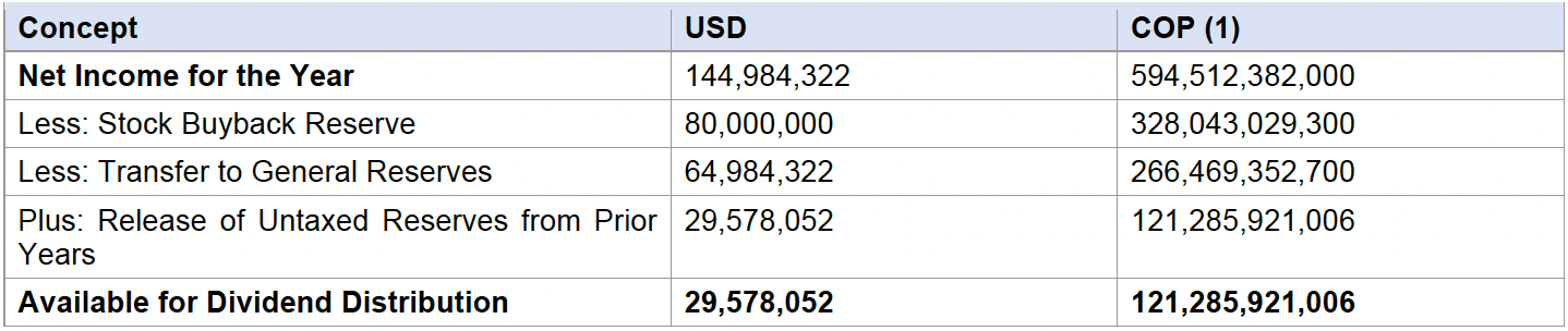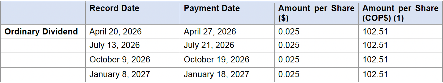 (1) U.S. dollar amounts converted to Colombian pesos for informational purposes, based on the average monthly Representative Market Rate (Tasa Representativa del Mercado – TRM) published by the Colombian Superintendence of Finance for the year ended December 31, 2025, of $1.00 = approximately COP$4,100.54, which includes adjustments on the translation to COP from US$ in accordance with IFRS.