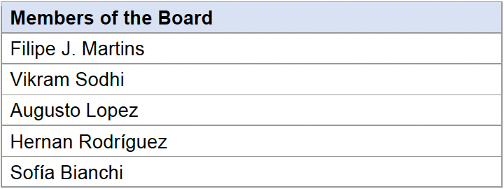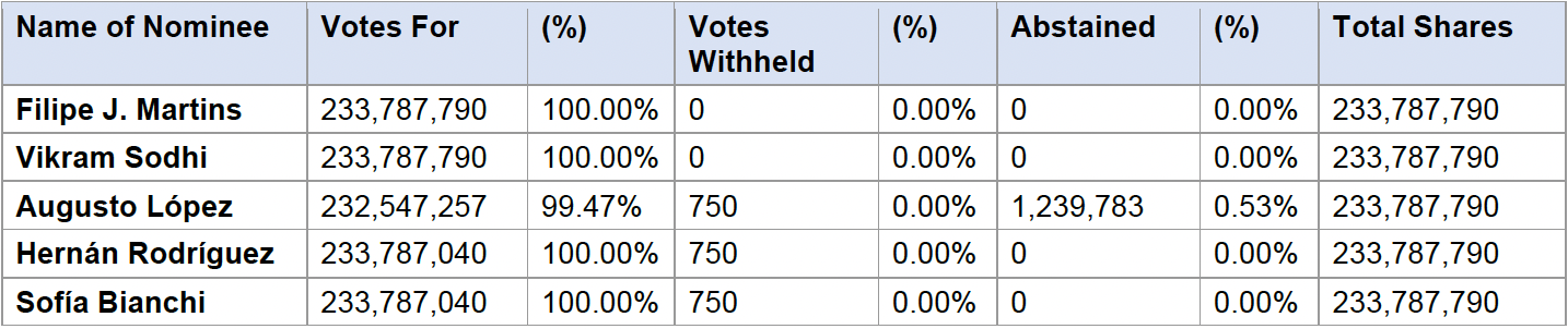 A single slate of five nominees was proposed for election at the Meeting. The slate, recommended by the Corporate Governance and Sustainability Committee and set forth in the Circular, consisted of Filipe J. Martins, Augusto López, Vikram Sodhi, Hernán Rodríguez, and Sofía Bianchi.