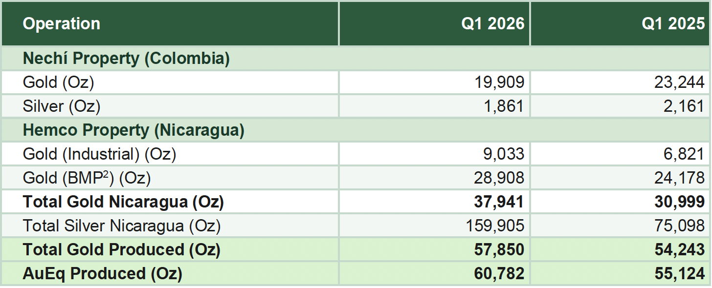 At the Nechí Property in Colombia, first quarter production of 19,909 ounces is slightly lower than average but in alignment with the mining plans. Recovery to normal production levels is expected in Q3 2026 as we advance to the following areas. In parallel, the Company is advancing continuous improvements to production rate and metallurgical recovery through disciplined operational execution, while formalizing additional partner operational units.